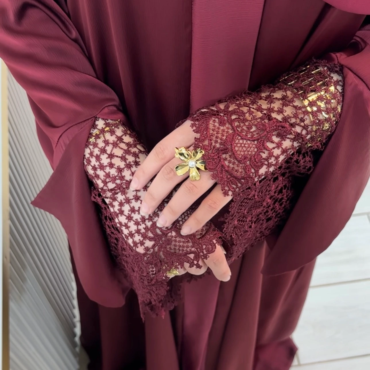 ما يميز هذه العباية هو تفصيل الغيبور (Guipure) على الأكمام، الذي يضيف لمسة أنثوية فاخرة تبرز جمال التصميم وتمنحه طابعًا مميزًا.